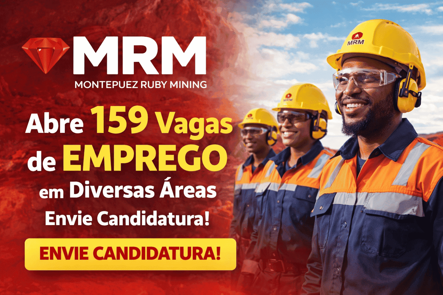 A Montepuez Ruby Minng Lda (MRM), empresa constituída segundo as leis moçambicanas, com a concessão mineira no 4703C, NUIT no 400323811, sediada na Av. Eduardo Mondlane, no 178, cidade de Pemba, Cabo Delgado anuncia a abertura de 159 vagas de emprego.